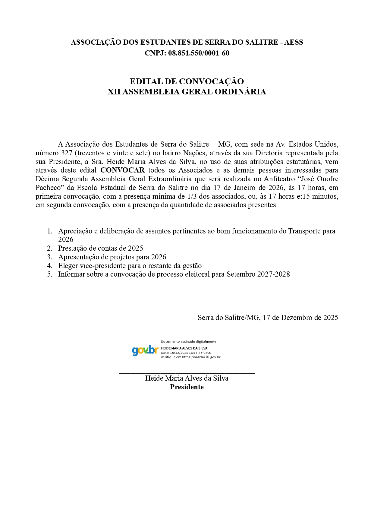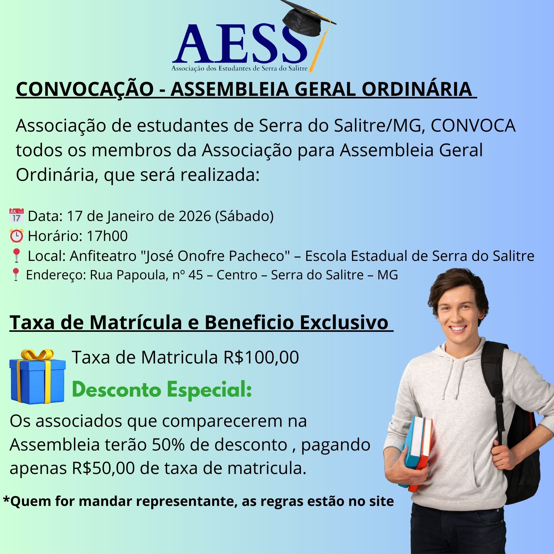 AESS - Associação de estudantes de Serra do Salitre/MG, CONVOCA todos os membros da Associação para Assemb